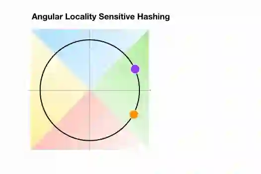 Angular LSH:普通LSH的一个变化,成为Angular LSH,使用不同的编码把点投影到单位球上预先定义好的区域里。然后一系列随机旋转的点定义了这些点所属的桶。让我们通过一个简单的2D例子来说明这一点,这个例子来自于Reformer的论文: