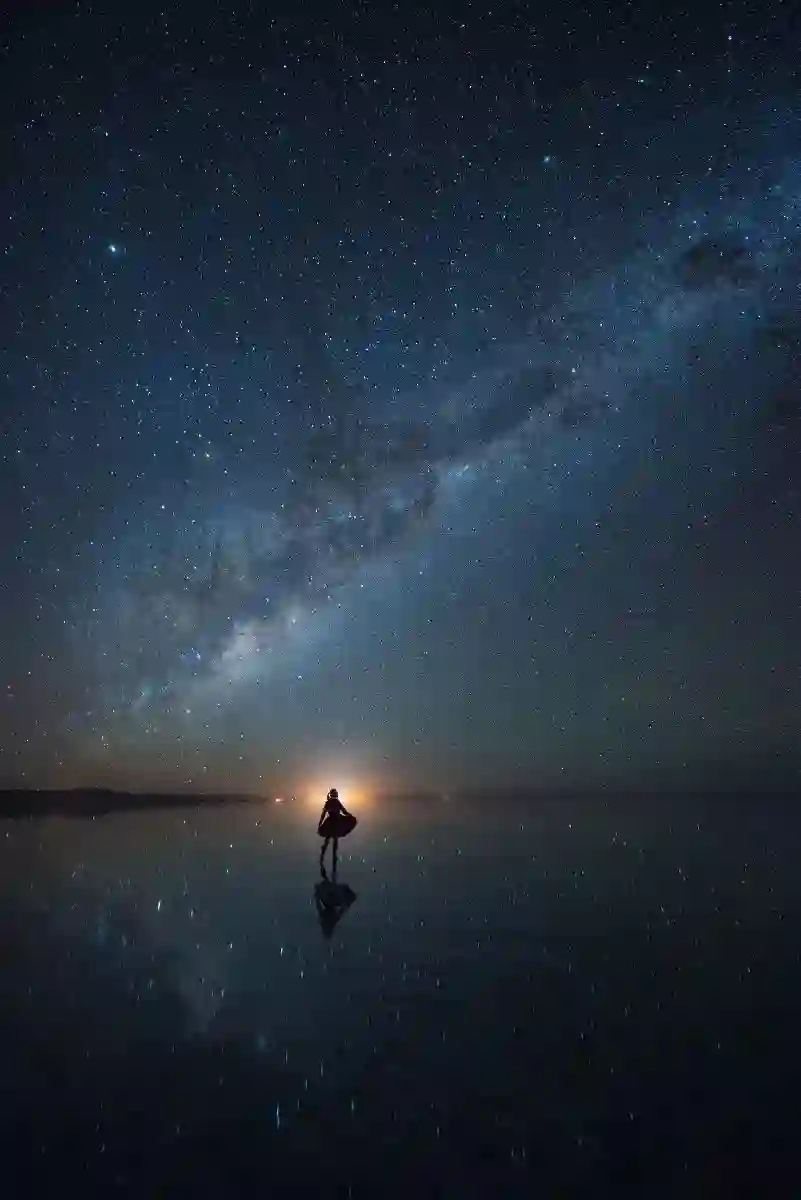 这张照片的设计非常巧妙。夜空的银河因为前景的舞者,而显得平衡不单调。舞者背后的灯光,很好的把人物从背景中分离了出来。水面上反射的点点星光,也让地面更加的丰富有趣。