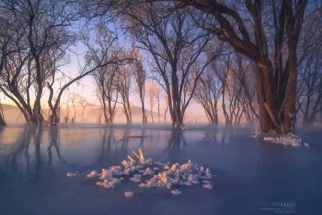 这张图片拍摄者利用了冰花和光线的点缀作为前景,同时左右两边较大的树木使拍摄者目光集中在画面中间,从前景逐渐往画面中间的倒影再到远处树林的观看。