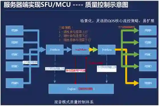 上图是后台音频质量控制系统示意图,在拓扑层面,提供 SFU 和 MCU 两种模式。并且通过三级决策机制来保障转发环节的质量。