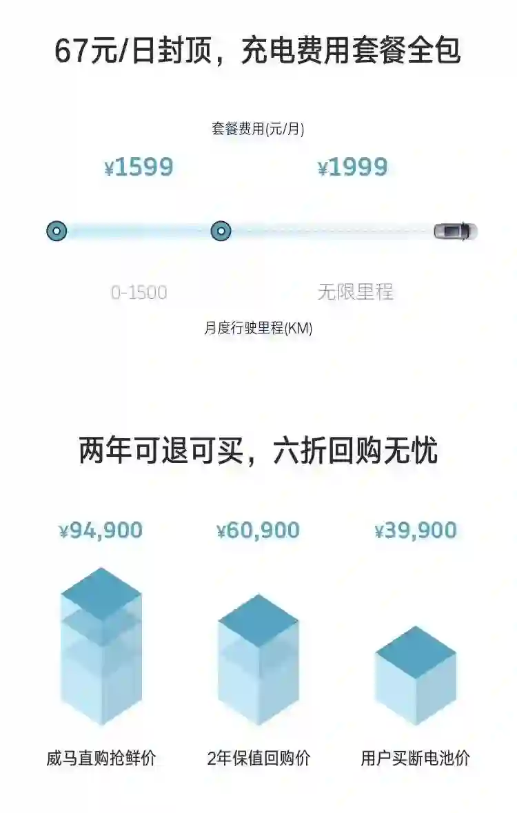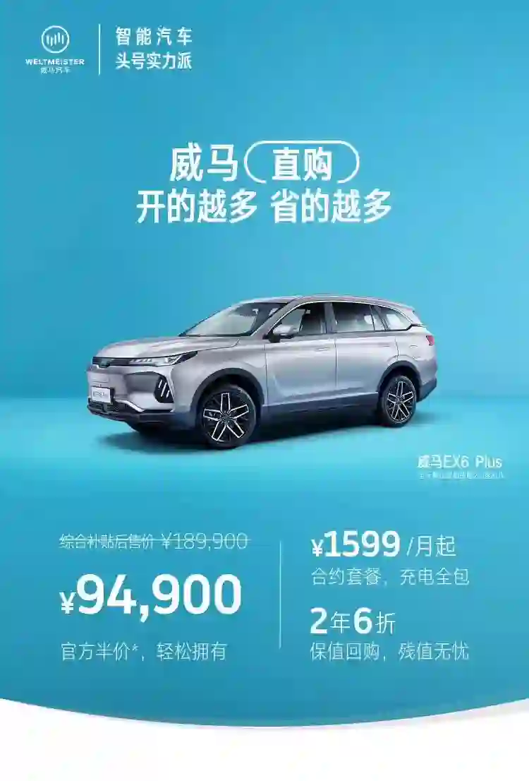 威马直购,与燃油车争食肺炎疫情这起黑天鹅事件瞬间加大了新造车公司的生存压力,创新求变无疑成为突围的重要筹码。威马汽车率先亮剑,这个利器就是“威马直购”。2020年春节前夕,威马汽车发布“威马直购”新零售模式,用户仅需首次支付9.49万元就能半价获得威马EX6 Plus 400轻享型,之后每月根据行驶里程择0-1500公里、1501公里-不限里程两档出行套餐,对应的月费分别是1,599元(约53元/日)、2,099元(约66元/日)。这个月费并不是传统意义上的分期贷款,而是可以用来充抵充电费用,相当于电信运营商推出的合约手机月费套餐,之前是“充话费送手机”,现在相当于是“充电费送车”。据悉,目前威马直购目前只针对威马EX6 Plus 400轻享版车型(综合补贴后售价18.99万元),这款车NEDC续航里程为400km。根据官方所公布的直购服务来看,消费者可以选择2年、4年和6年三个合约方案,到期后用户可买断电池、可以更优惠的价格续约,或者由威马官方保值回购。 这显然是一个创新的打法。李斌在谈到创立蔚来时曾说过,要选择一套让电动车与燃油车用车体验差别不大,但同时价格合理的模式,他的解决方案是换电。而威马的策略无疑更为激进,直接将整车价格下探至10万元以下,这是销量最广的燃油车的售价区间,相当于把电动车的市场触角直接深入燃油车腹地,开始与燃油车直接争食。为什么推出“威马直购”模式的是威马汽车?一位威马员工认为,一个重要原因是威马坚持了“开放融合”的合作理念,过去一年多在服务领域进行了大量拓展,“在充电服务领域,威马即客行已经携手国家电网、特来电、星星充电等12家主流运营商,接入超20万根公共充电桩,覆盖全国约43%的公共充电桩。值得一提的是,长途出行时,国家电网”十纵十横两环”的高速快充网络,能够提供便捷的大功率直流快充服务,进一步拓展用户的出行半径,实现从”城内出行畅行无阻"向"城际出行无忧"的跨越。”2019年的新能源车行业遭遇了多重打击,影响最大的显然是排放标准的切换。多位新造车公司负责人向36氪表示,“国标切换带来的燃油车甩货,对三四线城市的新能源车销量伤害深远,不光掉单达到15%到20%左右,甚至还侵占了未来新能源车的潜在市场。”而如何撕开这个口子,在产品体验和服务不输于甚至明显领先于传统燃油车的前提下,价格显然是最直接的利器。面对2020年更加残酷的生存形势,威马显然已经攥住了“威马直购”这张销量船票。
