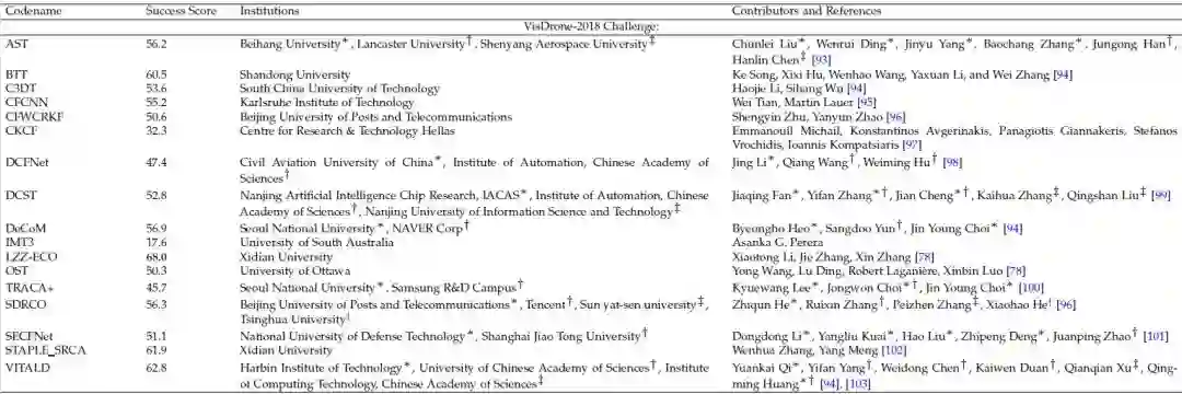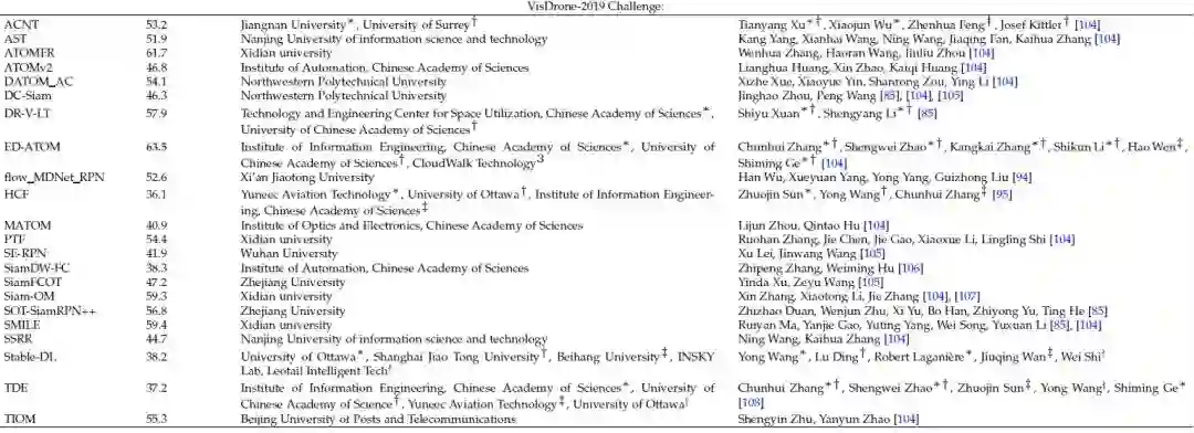 表6: 参加2018年和2019年VisDrone-SOT挑战赛的队伍,按字母顺序排列。