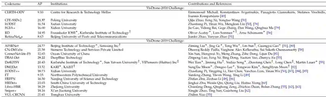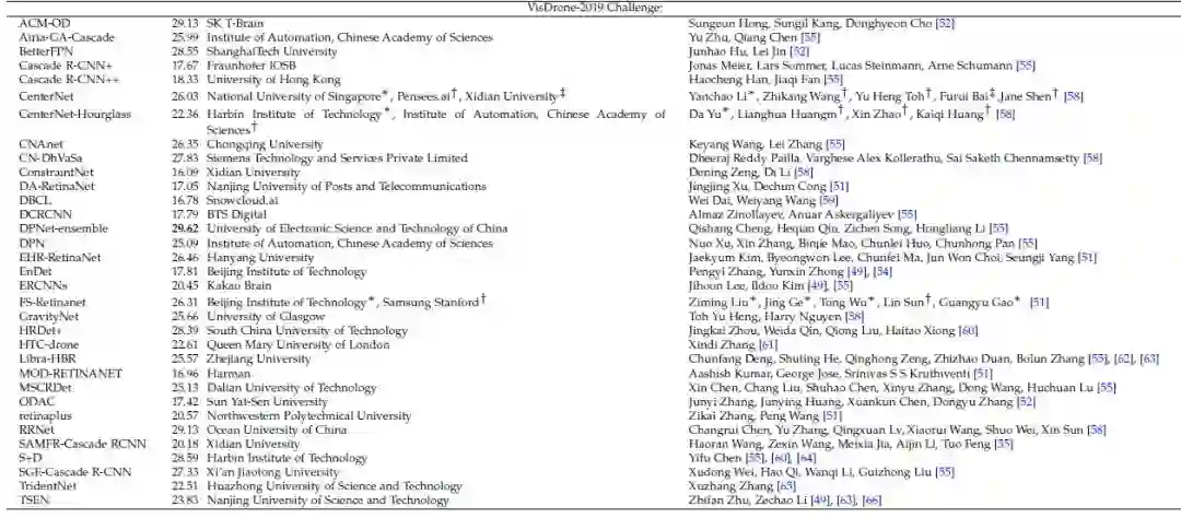 表2:参加2018年和2019年VisDrone-DET挑战赛的队伍,按字母顺序排列。