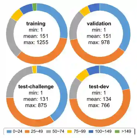 图2: 每幅图像的目标数量 vs. DET track中训练、验证、测试挑战和测试开发子集中图像的百分比。