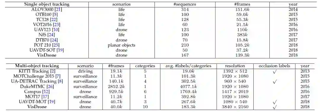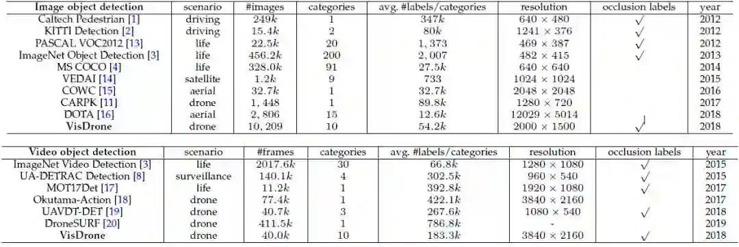 配备摄像头的无人机已经被快速部署到广泛的领域,包括农业、航空摄影、快速投递和监视。因此,对从这些无人机收集的视觉数据的自动理解变得非常困难,这将计算机视觉越来越紧密地带入了无人机。尽管一般的计算机视觉算法(如检测和跟踪)取得了很大的进步,但这些算法通常不是处理无人机捕获的序列或图像的最佳算法。这是由于各种各样的挑战,如较大的视点变化和规模。因此,为无人机捕获的视觉数据开发和评估新的视觉算法至关重要。然而,正如[10]和[11]所指出的,由于缺乏公开的大规模基准或数据集,对这一目标的研究受到严重限制。最近,[10]、[11]和[12]致力于构建无人机捕获的数据集,这些数据集主要用于目标检测或跟踪。由于数据收集和标注方面的困难,这些数据集的大小和涉及的场景仍然有限。对现有或新开发的算法进行彻底的评估仍然是一个开放的问题。为了进一步推进无人机平台视频分析研究,需要一个更通用、更全面的基准。