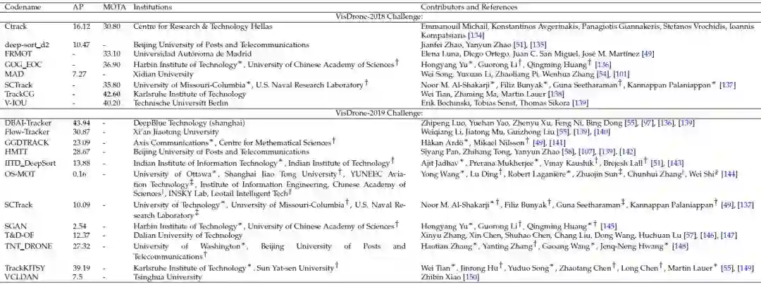 表7:参加VisDrone-MOT 2018和2019挑战赛的队伍,按字母顺序排列。