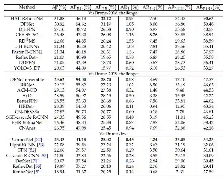 在这篇论文中,作者重点关注了2018年和2019年的VisDrone挑战,以及挑战的方法、结果和评估方案,希望这一挑战能在很大程度上促进相关领域的研究和发展。