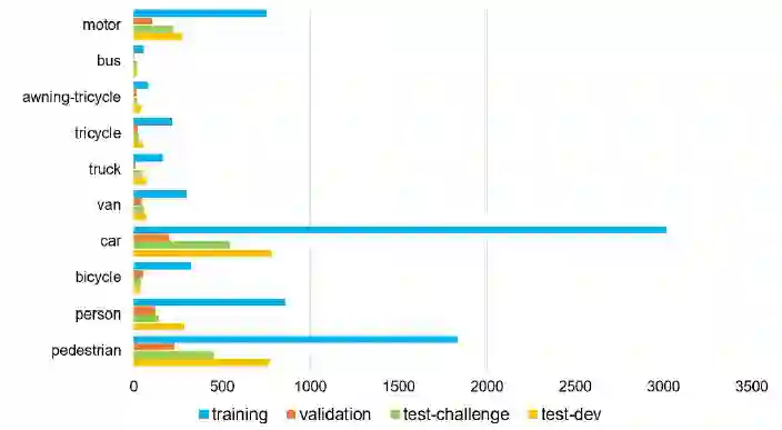 图3:DET track中训练集、验证集、测试挑战集和测试开发集中不同对象类别不同遮挡度的目标数量。
