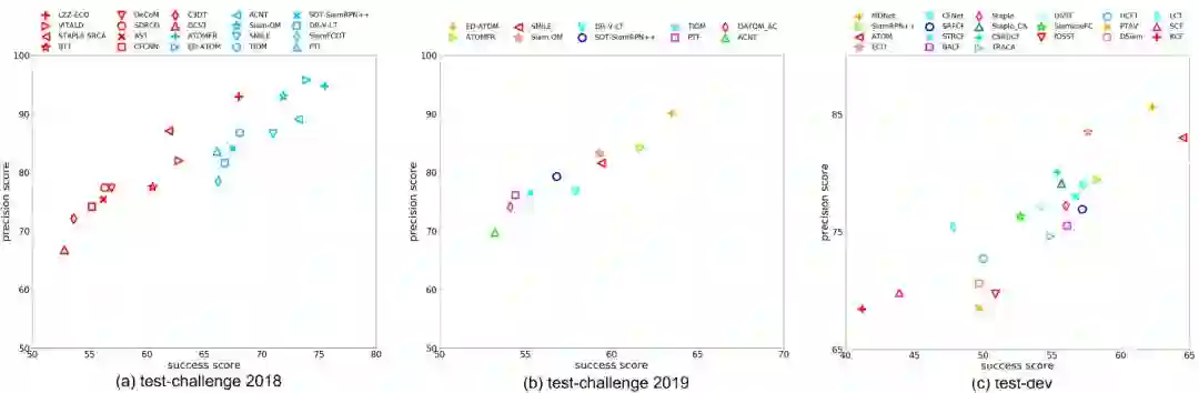 图8: (a)在2018年测试挑战赛中,VisDrone-SOT 2018(以红色标记表示)和VisDrone-SOT 2019(以蓝色标记表示)挑战中排名前10位的跟踪器的success vs. precision 得分。 VisDrone-SOT 2018和VisDrone-SOT 2019挑战中的跟踪器分别以红色和蓝色标记表示。 (b)在2019年测试挑战赛中,VisDrone-SOT 209挑战赛中排名前10位的跟踪器的success vs. precision 得分。(c)测试开发集上最先进的跟踪器的success vs. precision 得分。