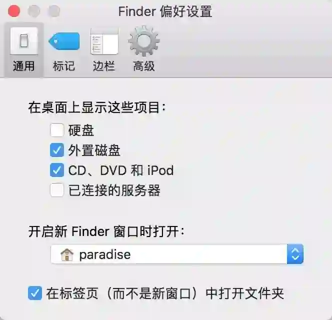 在通用菜单中,可以设置开启新 Finder 窗口时显示的文件夹