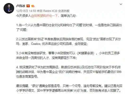 针对“小米低价误国”说法,小米中国区总裁、红米Redmi品牌总经理卢伟冰在微博上回应称,华为是中国企业“低价”战略的榜样,并且发达国家也有诸如宜家、Costco等品牌,小米有没有钱做研发,看看小米财报就可以(关键要会读),小米的员工很多来自全球一流高校的人才,没有高薪吸引不来。(36氪)