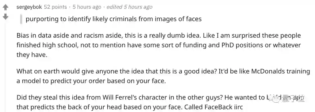 还有网友认为,依据面部图像去识别罪犯,这种想法并没有比让麦当劳通过面相,预测你今天是要吃麦辣鸡腿堡还是板烧鸡腿堡高明。