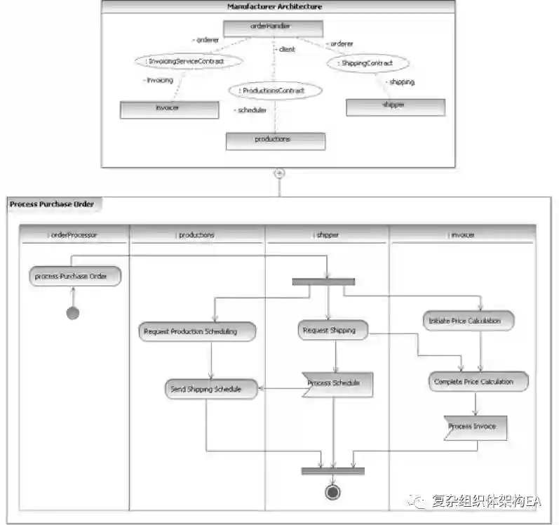 服务架构是使用标识符(一个分隔的矩形)显示的,而不是通常所用的 UML 协作省略号。UML 2 支持两种形式。该例使用矩形符号,因为对于角色它拥有更多的空间。