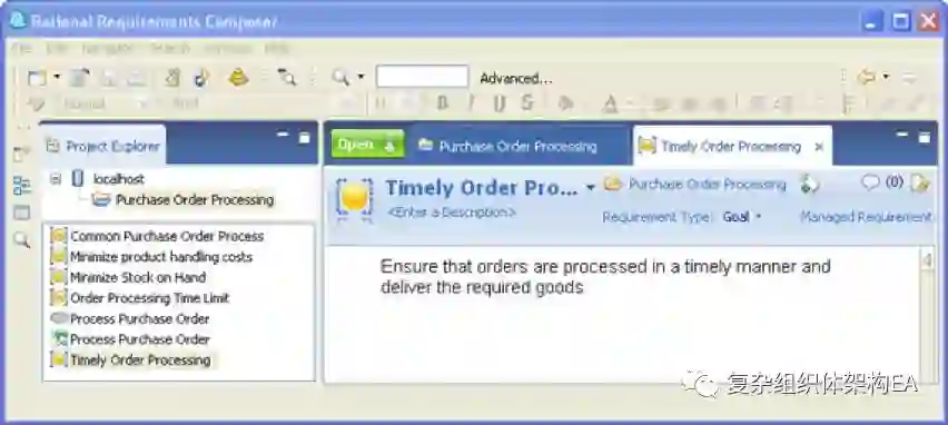 图 1 显示了 Rational RequirementsComposer 中获得的需求:注意要使 Process Purchase Order 业务用例能够满足所有的业务目标。