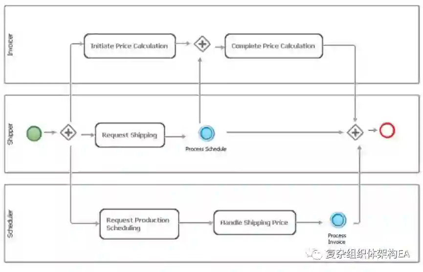 Purchase Order Process 是一个带有四个角色的服务架构,包括进程自身。通过检查分配给业务流程通道中角色的任务,可以从业务流程中得到这些角色。Rational Requirements Composer 使用业务需求的Business Process Modeling Notation(BPMN)进程中心视图;这使得消除进程需求与服务型方案的结构之间的鸿沟变得更加容易。服务架构还可以设计成实现从业务需求与进程中识别的功能。实际上,一个服务架构实际上可能是 BPMN 业务流程的不同视图。