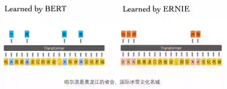 在 BERT 模型中,通过『哈』与『滨』的局部共现,即可判断出『尔』字,模型没有学习与『哈尔滨』相关的知识。而 ERNIE 通过学习词与实体的表达,使模型能够建模出『哈尔滨』与『黑龙江』的关系,学到『哈尔滨』是『黑龙江』的省会以及『哈尔滨』是个冰雪城市。