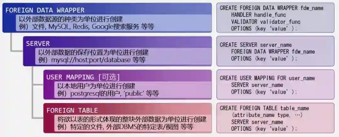 上一小节介绍了FDW的通用用法,这里将简单说明一下该用法中提及的几个数据库对象的作用: