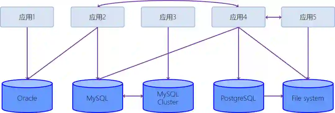 通常我们希望这些应用的DAC(Data Access Code)能够简单直观一些。然而不幸的是,即使是在同一个企业或组织的内部,不同应用所涉及到的数据往往会存储在不同的数据源中——可能是不同厂商的DBMS产品,也可能是根本不支持SQL的异构数据存储中。因此,往往随着应用规模的增大,多个应用之间数据访问关系就会变得像下图一样杂乱无章: