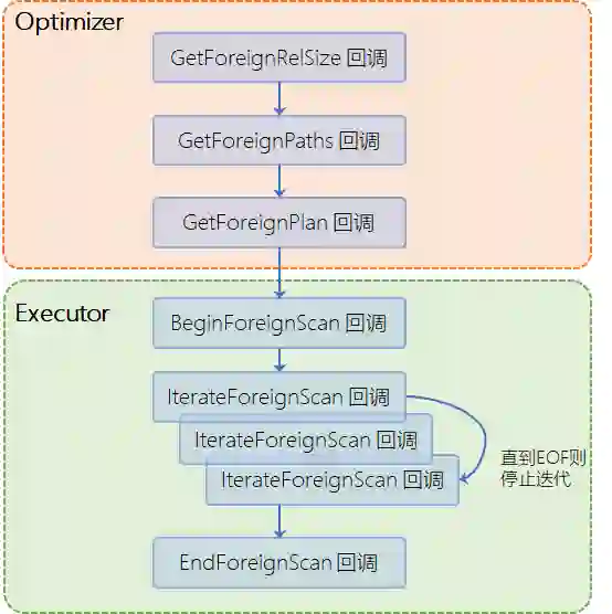 如上文所说,一个FDW实现的核心就是实现一组回调函数。有了这些回调函数的帮助,在查询外部表对象的执行过程中就可以将运行逻辑切换至自定义的扩展代码中,进而遵照PG的内部机制实现对外部数据源的访问。