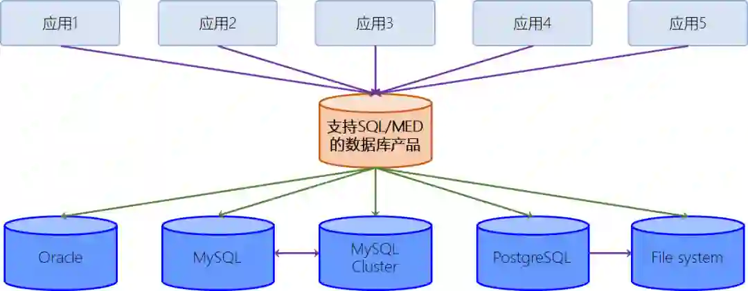 SQL/MED标准旨在建立一个解决此类课题的技术规范:即应用程序可以通过统一且标准的方式(SQL)去访问存储在不同数据源中的数据,且数据源本身对应用透明。在理想情况下,SQL/MED标准希望达成的效果如下图所示: