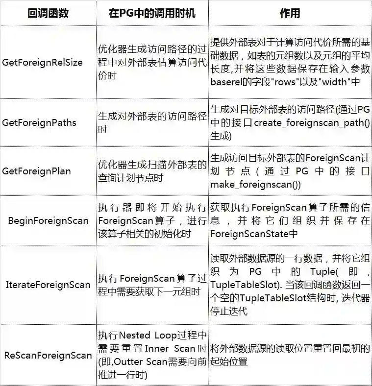 需要补充说明的是,HANDLER的作用是将该FDW实现的一系列fdw回调函数的地址打包返回给PG,从而使PG之后访问外部表时可以调用这些访问外部数据的函数。而所谓的fdw回调函数则是指PG手册所提及的下述接口的实现: