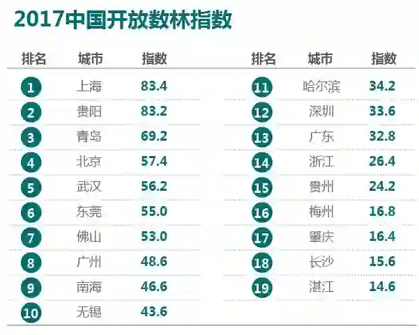 《中国地方政府数据开放平台报告》(以下简称「报告」)在 2017 中国国际大数据产业博览会期间发布。报告从数据集数量、开放授权协议、元数据覆盖率等方面评估地方政府的数据开放平台,发布了「开放数林指数」。