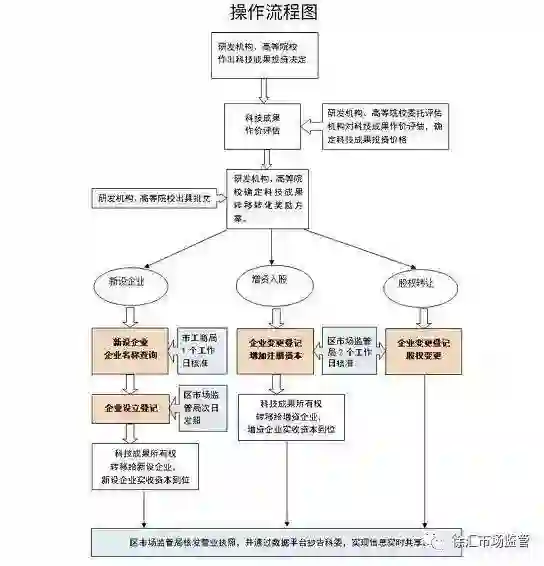 今年年初,科教资源、人才资源得天独厚的上海市徐汇区科委等 5 部门印发了《徐汇区促进科技成果转化操作指导规程》,首次推出科技成果转化注册登记的清晰详细「路线图」(如下)。