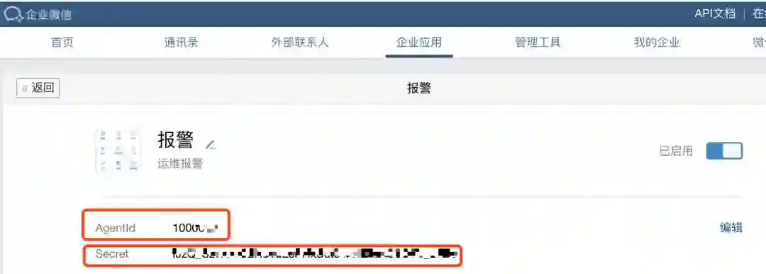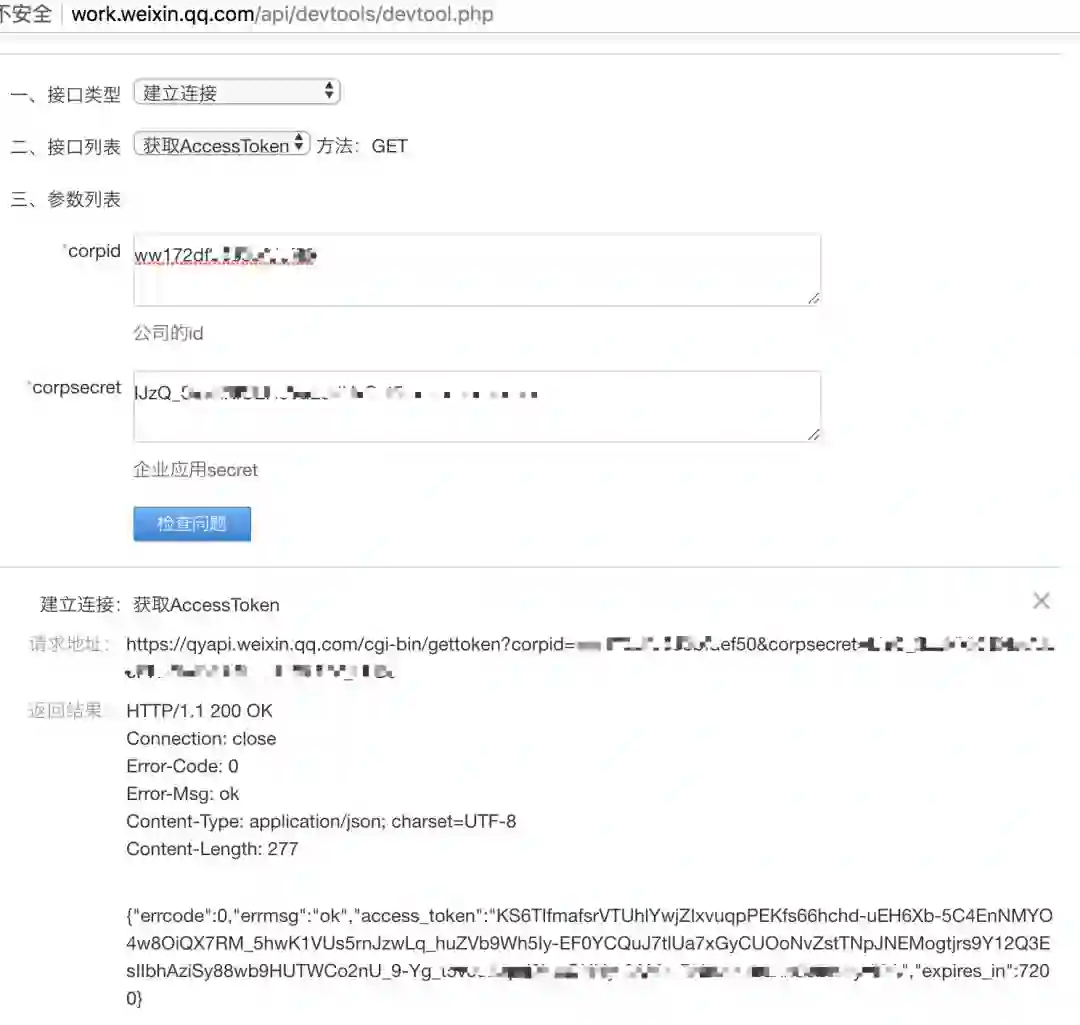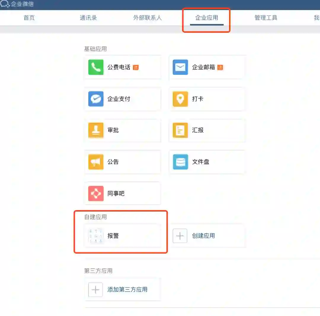 一:创建自建应用「报警」,然后用公司corpid和企业应用secret获取token,https://qyapi.weixin.qq.com/cgi-bin/gettoken?corpid=$corpid&corpsecret=$corpsecret
