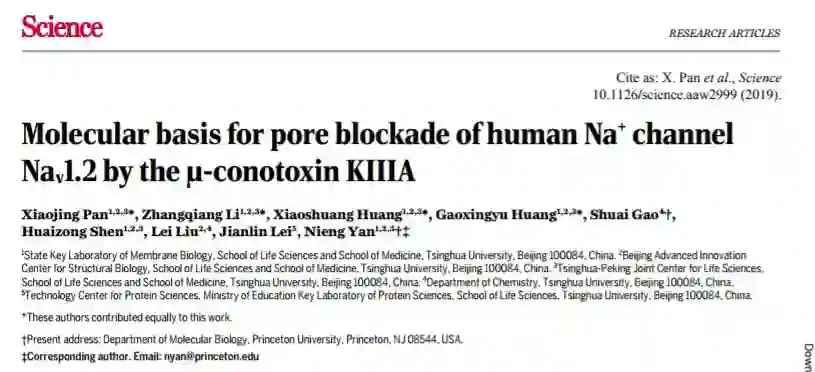 当地时间2019年2月14日,颜宁研究组在《科学》(Science)背靠背在线发表了题目分别为《μ-芋螺毒素阻断人源电压门控钠离子通道Nav1.2的分子机理》(Molecular basis for pore blockade of human Na+ channel Nav1.2 by the μ-conotoxin KIIIA)和《人源电压门控钠离子通道Nav1.7与辅助亚基和动物毒素复合物的结构》(Structures of human Nav1.7 channel in complex with auxiliary subunits and animal toxins)的两篇研究长文。