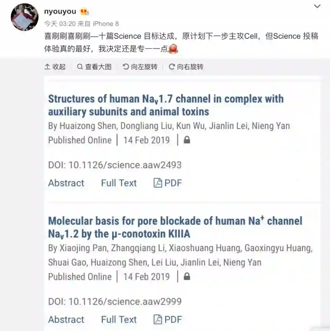 两篇文章在线发表后,颜宁也第一时间在微博上表示了庆贺: