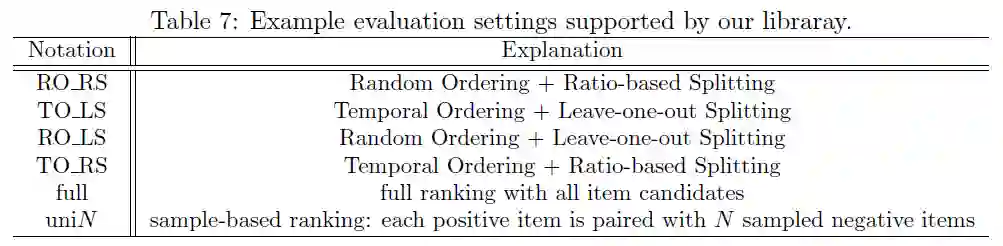 面对高级用户和二次开发者,同时提供了非常灵活的评测接口,用户可以使用简单的代码和参数来实现不同组合的采样和数据分割方式,并将常用的组合进行打包,实现快速的配置。据我们所知,这是当前支持最为全面评测方式的推荐开源框架。支持不同的数据集合切分方式、采样方式等。各个评测方式的详细含义和区别可以参考我们最新CIKM的短文 [2]。