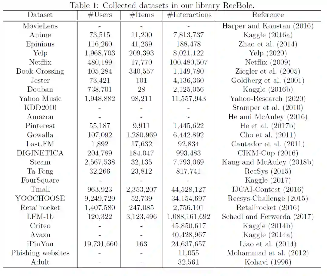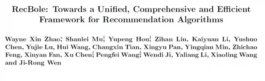 [1]Wayne Xin Zhao, Shanlei Mu, Yupeng Hou, Zihan Lin, Kaiyuan Li, Yushuo Chen,Yujie Lu, Hui Wang, Changxin Tian, Xingyu Pan, Yingqian Min, Zhichao Feng,Xinyan Fan, Xu Chen, Pengfei Wang, Wendi Ji, Yaliang Li, Xiaoling Wang, andJi-Rong Wen. 2020. RecBole: Towards a Unified, Comprehensive and EfficientFramework for Recommendation Algorithms.arXiv preprint arXiv:2011.01731(2020).