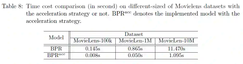 针对目前多个研究提到的采样偏差问题,本框架支持使用高效实现的全排序评测来进行消除,为此,本框架在评测部分专门针对全排序设计了优化算法,并开辟专门接口给需要进行全排序评测的模型,经过实际测试,在全排序评测中本框架优势非常明显(注:以下测速均为开发成员本机测试结果)。