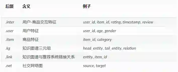 目前RecBole支持 6 种原子文件,他们通过后缀名进行区分。