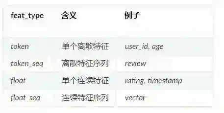 每个原子文件可以被看作m行n列的表格(不计表头),代表该文件存储了n种不同的特征,共m条记录。文件第一行为表头,表头中每一列的形式为feat_name:feat_type,标示了该列特征的名字及类型。约定特征为四种类型之一,他们都可以被方便地转化为按batch组织的张量。