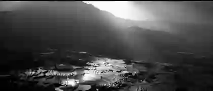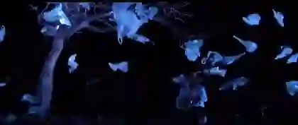 《对话·寓言》的开场是一段陕北曲调唱书,这是北方盛行的说唱艺术,让人想起信天游里的情歌对唱,曲牌名叫“刮大风”。我坐得高且远,起初看到的是,舞台上空飘下许多白色纸片,悠游而下,并不径直落地,而是随着“大风”,忽而又起。仔细听,有细微的嗡嗡声,是无人机。它们总共有66台,自重才45克,白色纸片则是塑料袋,它们在程序安排下精确飞行。