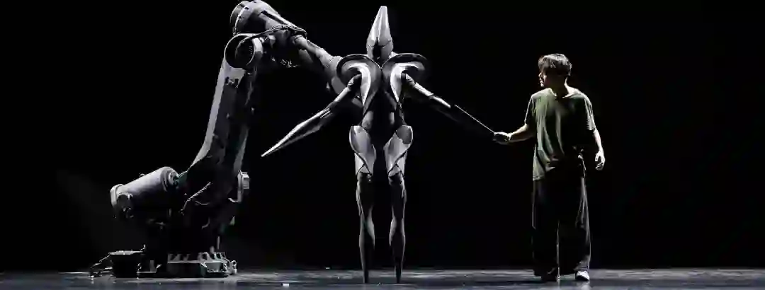 屏幕后面的机械臂隐在黑处,不过它很快就让我们目睹了真容。之后的《南音·爱》的舞台古朴,景深深处两间斗室,一左一右分别是南音琵芭和南音洞箫,行腔低沉,不过它们在这场中退居其次,舞台中央庞大的机器人和机器人背后的机械臂才是主角,它,正与人类共舞。