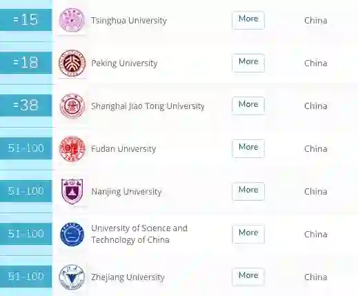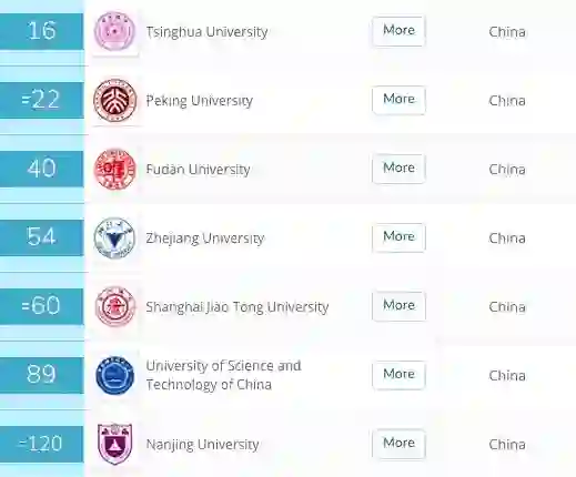 除了清华北大外,进入前100名的还有:复旦大学(40名)、浙江大学(54名)、上海交通大学(60名)、中国科技大学(89名)。南京大学位列第120名,进入前200。