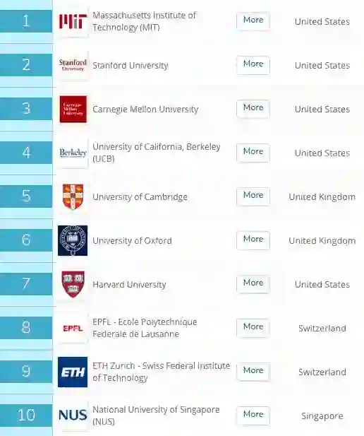 第二和第三名是斯坦福大学、CMU。四到十名分别是:加州大学伯克利分校、剑桥大学、牛津大学、哈佛大学、洛桑联邦理工学院(去年并列第18名)、苏黎世联邦理工学院、新加坡国立大学。