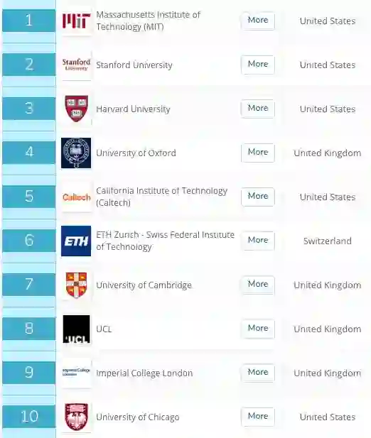MIT、斯坦福大学、哈佛大学、牛津大学、加州理工学院、苏黎世联邦理工学院、剑桥大学、伦敦大学学院(UCL)、帝国理工学院(Imperial College London)、芝加哥大学。