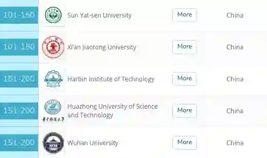 中国内地排名在100-200的高校包括:中山大学、西安交通大学、哈尔滨工业大学、华中科技大学、武汉大学。也就是说,中国内地共12所高校进入Top 200。