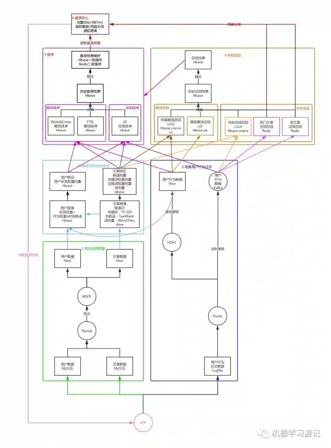 这里以文章推荐系统为例,讲述一下推荐系统的完整流程,如下图所示: