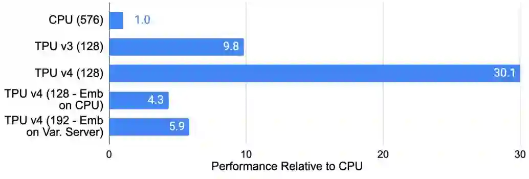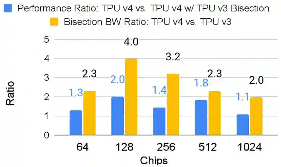 在特定芯片数量下,TPU v3/v4 对分带宽比高 2-4 倍,嵌入速度可以提高 1.1-2.0 倍。
