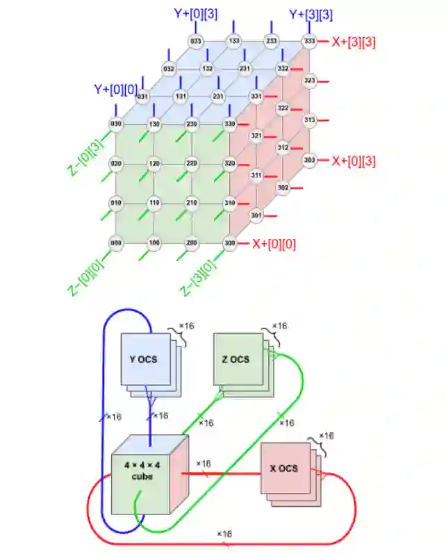 「这种切换机制使得绕过故障组件变得容易,」谷歌研究员 Norm Jouppi 和谷歌杰出工程师大卫・帕特森在一篇关于该系统的博客文章中写道。「这种灵活性甚至允许我们改变超级计算机互连的拓扑结构,以加速机器学习模型的性能。」