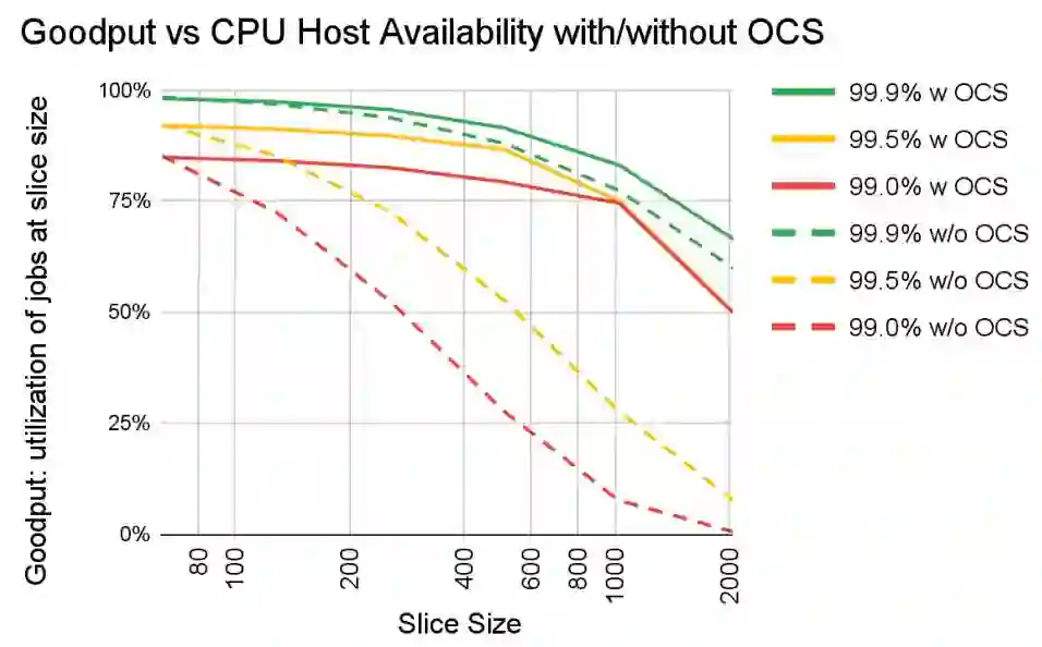 与超级计算机一样,工作负载由不同规模的算力承担,称为切片:64 芯片、128 芯片、256 芯片等。下图显示了当主机可用性从 99.0% 到 99.9% 不等有,及没有 OCS 时切片大小的「有效输出」。如果没有 OCS,主机可用性必须达到 99.9% 才能提供合理的切片吞吐量。对于大多数切片大小,OCS 也有 99.0% 和 99.5% 的良好输出。