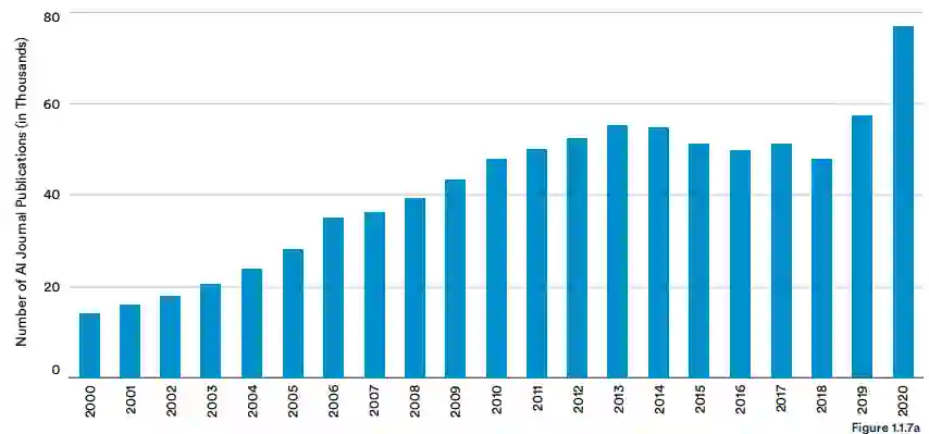 数据统计,2020 年, AI 期刊论文数量是 2000 年的 5.4 倍。arXiv上2020年发表的AI论文比2015年相比翻了6倍。