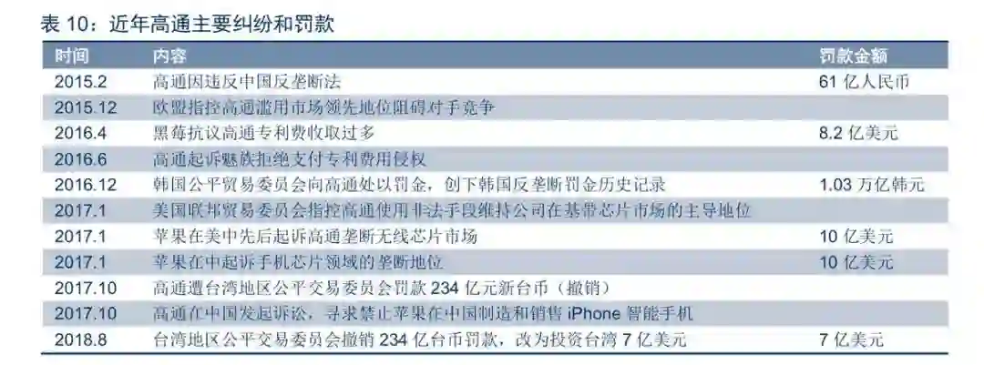 高通以整机成本为基础的收费模式正在受到越来越多的挑战。从2009年到2018年期间,高通在全球范围内因垄断或妨碍公平竞争等问题,受到行政罚单总额达40多亿美元。这影响了高通的营收,也给其业务模式和盈利能力埋下不确定性。