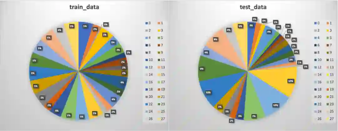该任务的数据集共包含 1200 条样本,其中训练集数据约 400 条,测试集数据约 800条。训练集中的各类别数目在 5~15 条之间,属于典型的小样本任务。