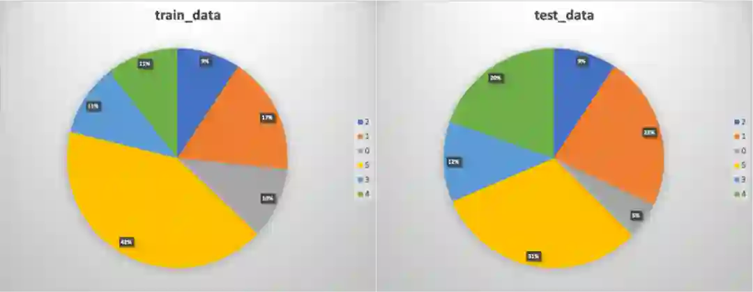 该任务的数据集共包含 3000 条样本,其中训练集数据约 1100 条,测试集数据约 1900 条,各类别分布情况如下: