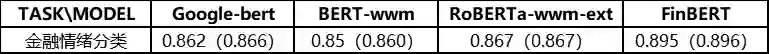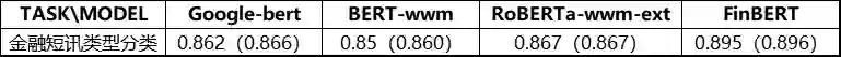 对比 FinBERT 和 Google 原生中文BERT、 BERT-wwm、RoBERTa-wwm-ext 这三种通用领域的预训练模型可知,FinBERT 效果提升显著,在 F1-score 上平均可以提升 2~5.7 个百分点。